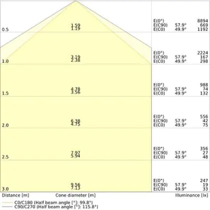 ![]() De kleurcode is een combinatie van de kleurweergave (CRI) en lichtkleur (Kelvin). Het eerste getal is de kleurweergave (1 = zeer slechte kleurweergave, 9 = maximale kleurechtheid). Het tweede en derde cijfer betreft de lichtkleur. Een lamp met kleurcode 830 heeft bijvoorbeeld een goede kleurweergave en straalt een warm wit licht uit (3000K), waar een lamp met de kleurcode 940 een uitstekende CRI heeft en een koel wit licht (4000K) uitstraalt. |